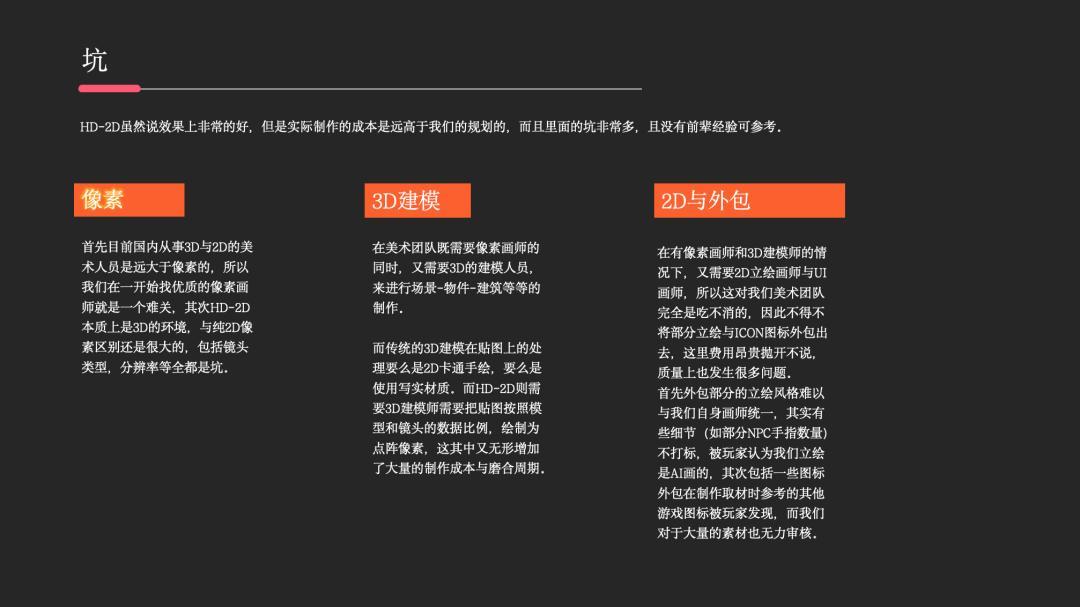 因爲前者意味着上百萬字的文本量,以及隨之而來的風格統一和翻譯問題。後者則看似是成本低的像素畫風,卻又包含了許多3D要素,做起來遠不如想得那麼簡單。也因爲這些踩坑的經歷,他們做遊戲的時間越拖越長,甚至在四年內資金鍊斷了三次。