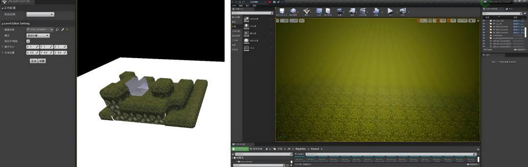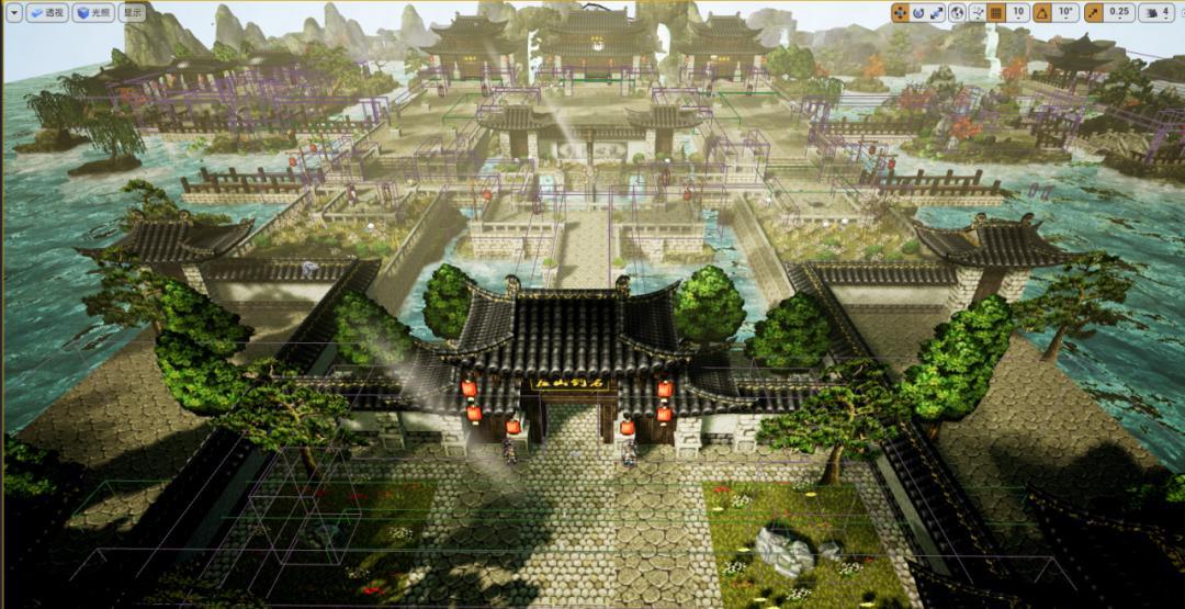 在復古的地編工具搭建場景的基礎上,同時也使用了UE自帶的真實地形工具去製作一些地形起伏與高低差,然後將比較規整的地形邊緣貼上3D建模的東方風格的岩石包邊,使整個場景既有RPG方正復古感又有擬真實場景的感覺。