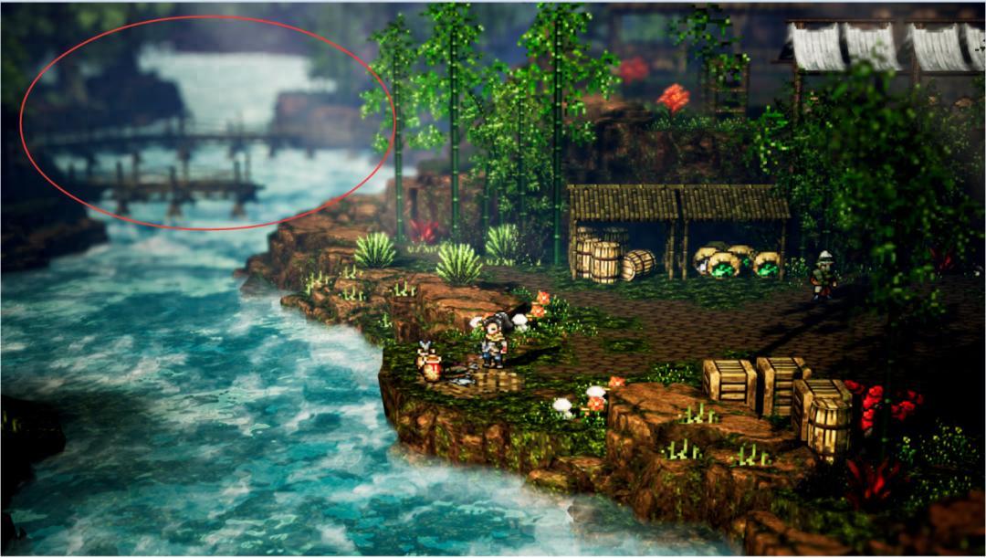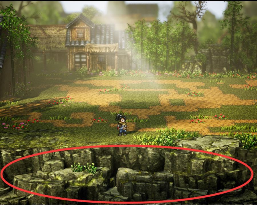 HD-2D這種風格的渲染實際上是3D環境中的一種表現形式。場景裏的物件、建築都是3D建模完成的,不同於一般直接用手繪貼圖或高清材質貼圖的方式,HD2D的貼圖需要以像素點陣的方式去呈現。所以,這就需要2D像素畫師和3D建模師密切配合,不像通常的3D建模流程那麼簡單。