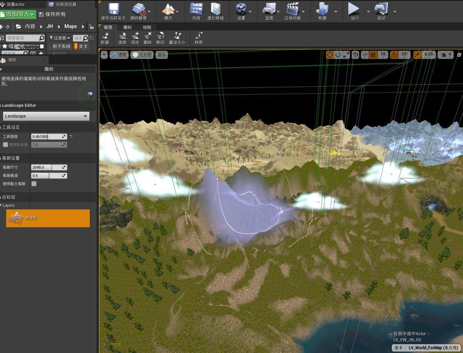 爲了更好地把控大地圖細節,《逸劍風雲決》是3D美術先在MDX裏做出大概的輪廓,然後使用灰度圖導入UE裏後生成基礎地形,再使用UE地形工具進行細節刻畫。這些山巒起伏都是使用UE地編工具手動雕刻的。