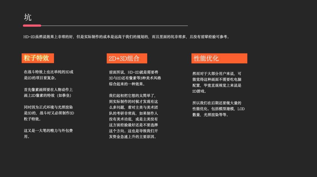 自2018年立項,他們一邊做一邊學,在資金捉襟見肘時,才決定要註冊公司去拉投資;做完兩種戰鬥模式,才意識到其實有點「頭鐵」……可以說踩了無數的坑才走到今天。在分享的末尾,吳迪也展示了大量HD-2D效果的製作細節,希望給其他開發者一些參考。
