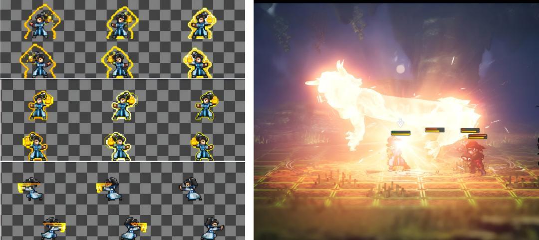 除了本身2D人物招式的像素特效,也增加了3D的模型和粒子特效配合燈光與曝光來增強效果。