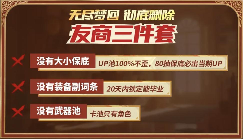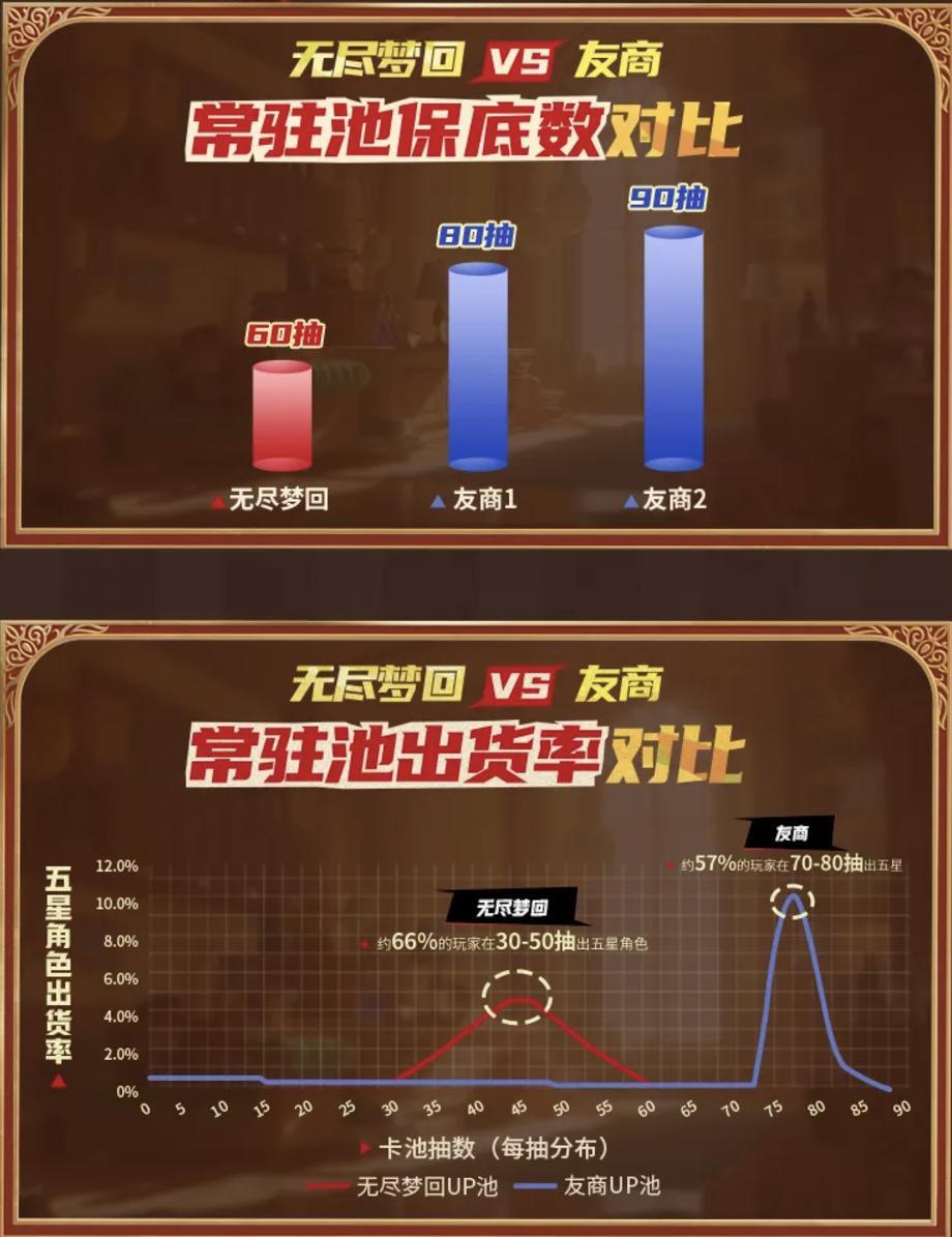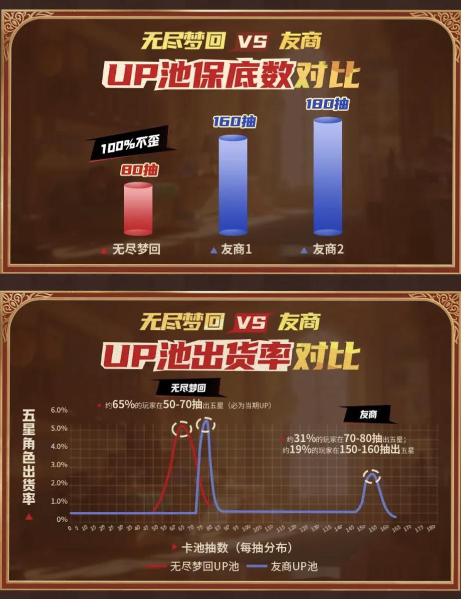 第一是降氪:他們承諾UP卡池僅80抽保底,100%不歪,常駐卡池則降爲60抽;抽卡單價同樣降低了一些,雖然看起來降得不算太多……但出貨率的升高,肯定是大大降低了玩家獲取角色的門檻。同時由於《無盡夢迴》中多角色肉鴿的機制設計,你擁有的角色越多,局內能獲得的迴響、形成的構築也就越多。