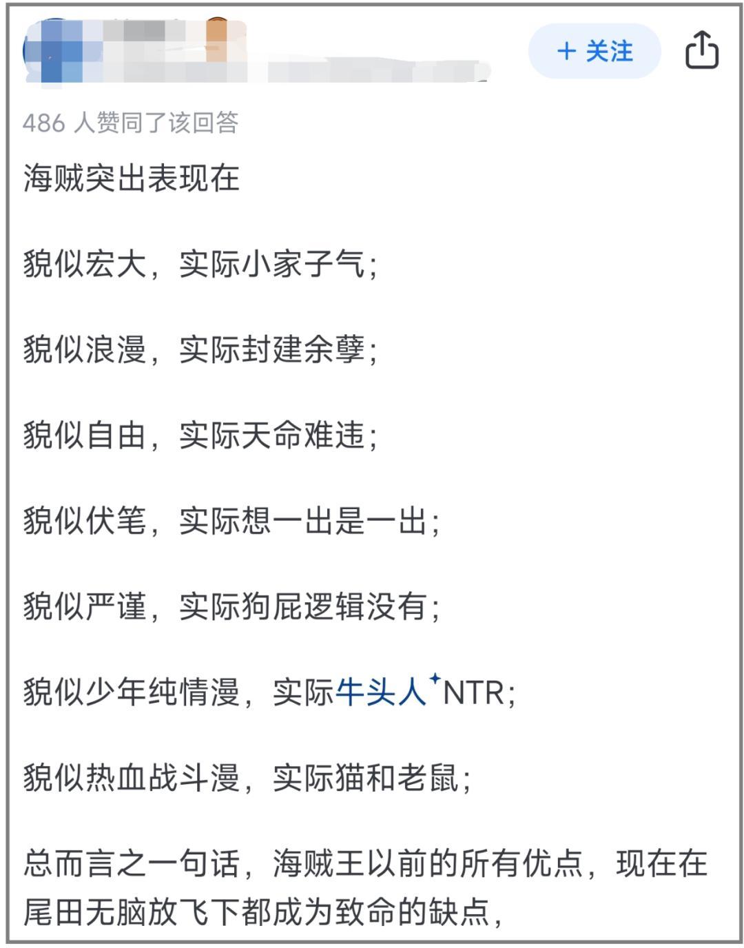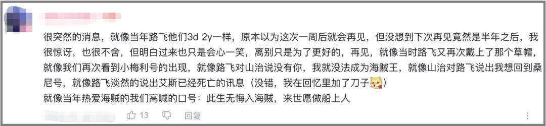 對於粉絲來說,等待連載作品更新的日子,往往都焦急難耐,像一千隻螞蟻在心窩那般熱辣滾燙。但是《航海王》這次的雙停更卻不太一樣——你能在各家討論區的前排,看到“好事”、“早該停了”,甚至負面情緒更直觀激烈的粉絲評論。事實上,自和之國篇以來,你就能感受到許多海米壓抑許久的不滿。而這股消極情緒,在最新的蛋頭島篇並未得到緩解。於是不滿演變成了失望,具象化爲前文所引用的海米在社交平臺發佈的諸多“無所謂”的表達。“看似宏大,實則家族矛盾;看似浪漫,實則封建餘孽;看似自由,實則天命難違;看似少年純情,實則牛頭人NTR......”《航海王》的問題出在哪,也許每個海米都有自己的獨到見解,但在我個人看來,可以總結爲一件事:海米們究竟想看到什麼樣的《航海王》?這個問題的答案,可以從一些脫離主線劇情的視角得到。前不久,BB姬曾寫過一篇關於特別篇動畫《航海王:粉絲來信》 的文章,這部作品的口碑之高,超出了所有人的預期;去年底,Netflix宣佈《航海王》動畫將從第一集開始重製,這個消息讓無數海米興奮不已。所以比起未知的新劇情,爲什麼許多海米反而更喜愛過去的冒險和小人物的故事?——因爲愛它們,是愛這些小人物的經歷,愛它們真正表現出了《航海王》與觀衆之間的純粹,愛那個被時光埋藏在你內心深處的,會爲了一羣執着追求夢想的笨蛋而眉飛色舞、歡呼雀躍的笨小孩。那個時候,草帽路飛還不是上天選中的命運之子,他只是個笨頭笨腦、隨處可見,但永不言棄的普通少年;出海冒險,也不是爲了拯救世界,而是因爲在海的另一邊,有許多新奇有趣的東西在等待着你去發掘。當然,《航海王》後期可能存在的問題,未必是尾田老師的創作失誤,或者作品背離了初心。每部長篇連載的作品,幾乎都會陷入相似的困境,在其中《航海王》已經算做得相當好、相當照顧老粉絲情緒的作品了。