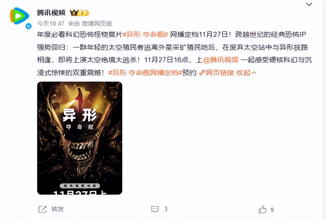 騰訊視頻、愛奇藝、優酷共同宣佈,年度必看科幻恐怖怪物爽片《異形:奪命艦》網播定檔11月27日。