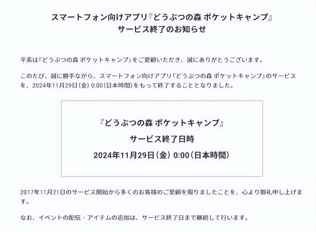 任天堂宣佈手遊《動物森友會:口袋露營廣場》將於11月29日停止服務,該作最初於2017年11月21日上線,登陸iOS和安卓,截止到停服已經運營了7年時間。