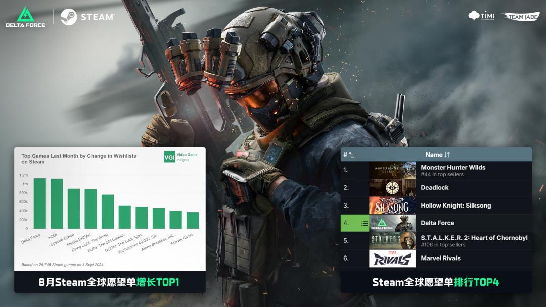 在上週末的新版本前瞻直播中,《三角洲行動》製作人Shadow也官宣了遊戲的一系列成就:註冊用戶數突破4000萬,首月全網視頻播放量超120億,日均開播主播數超3萬;遊戲還在Steam的10月新品節期間,獲得了三榜第一,目前它已經擠進了Steam願望單排行榜Top 4,其海外關注度可想而知。