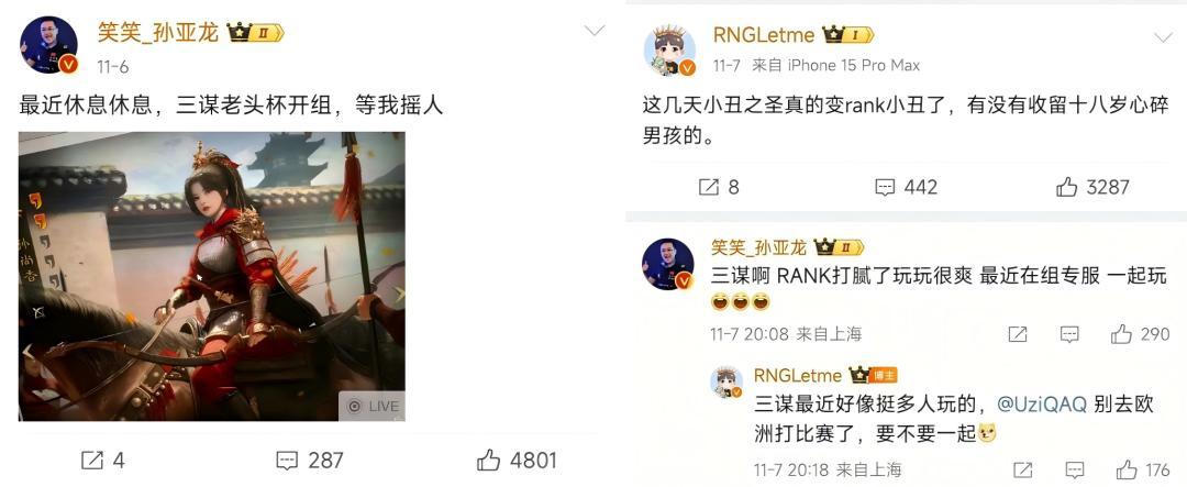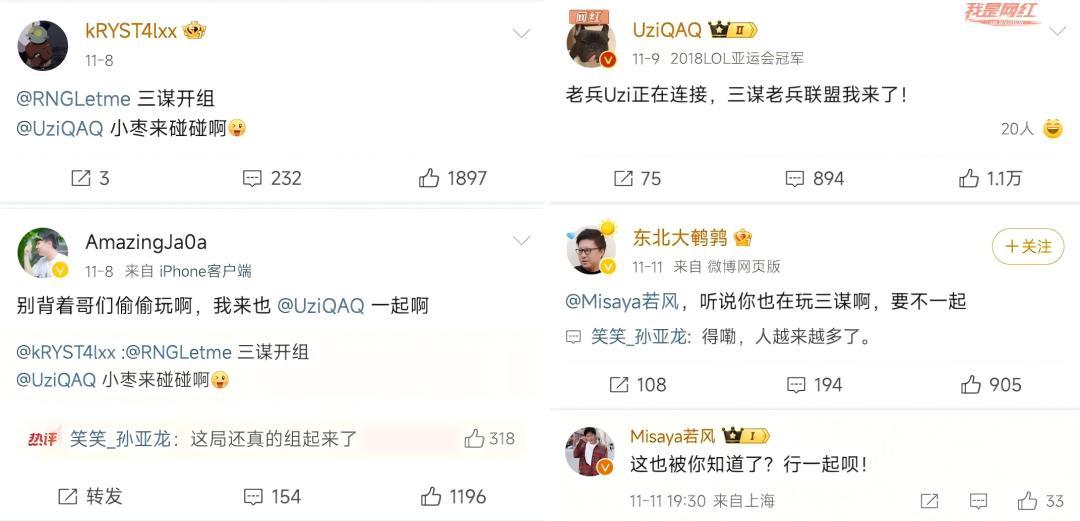 見狀,笑笑也不裝了,直接發微博搖人,說要組個《三謀》老頭杯。這不搖不知道,一搖才發現,LOL圈裏有一堆玩《三謀》的。