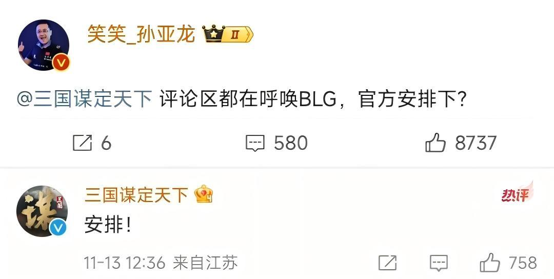 眼看參與老頭杯的主播越來越多,水友開始慫恿笑笑去拉剛打完S賽的BLG下場。於是他又艾特了《三謀》官方:“安排下?”後者也很快回應,“安排!”不僅安排BLG加入比賽,遊戲官方還特地準備了個更體面的比武臺——直接把半週年主題服做成了和BLG及主播的聯動服。
