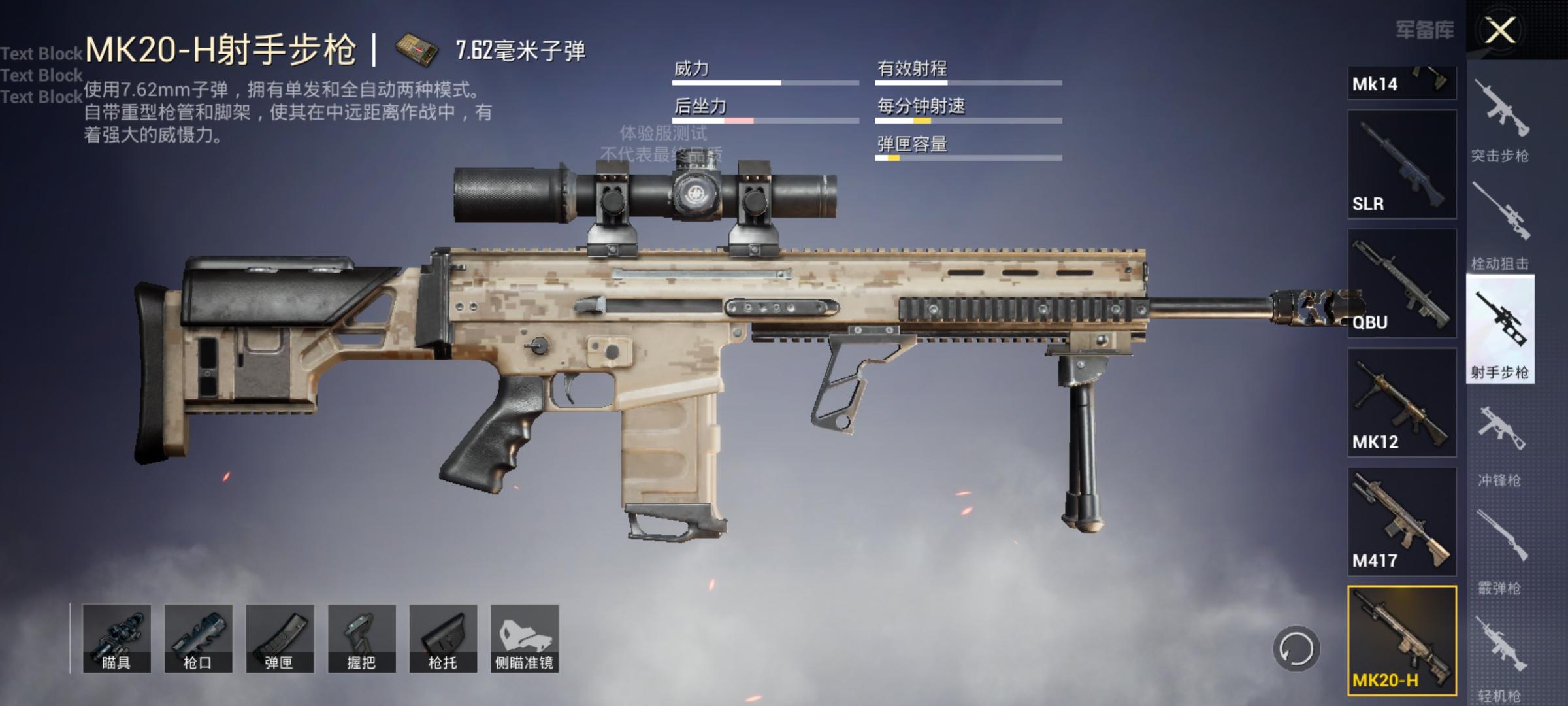 首先就是新武器MK20-H射手步槍,這是1把7.62系列的連狙,可以裝全配件和全倍鏡,最高載彈量是20發,擁有全自動和單發模式。光這樣看上去,配置確實很“豪華”。