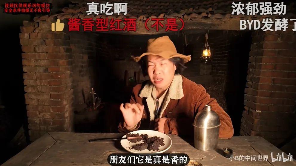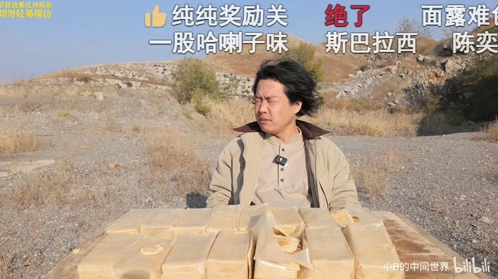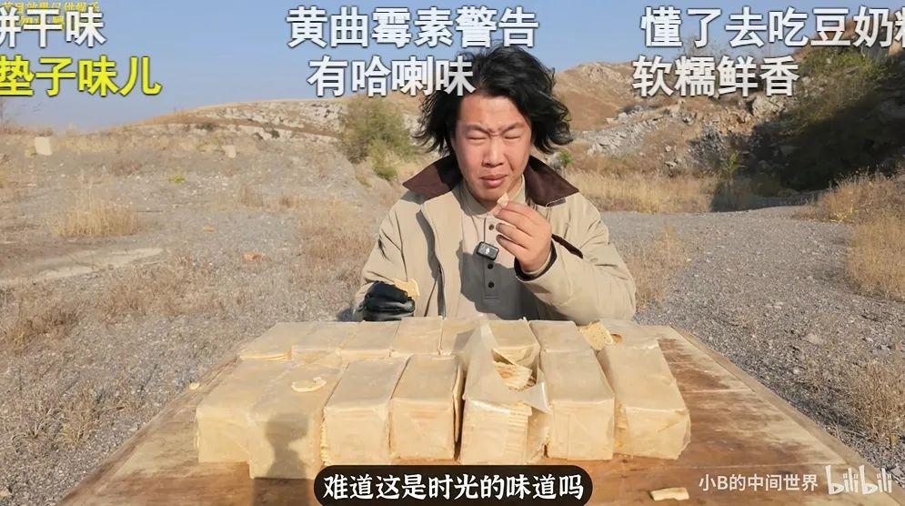 後來,普通的生存餅乾也不能再滿足小B的胃口了,他得先把它埋進土裏,過一年後再挖出來喫,乃至需要靠金屬探測儀來找到罐頭去了哪兒。爲了烘托氛圍,他還爲視頻配上《黃金三鏢客》的經典BGM“黃金狂喜”,只見三名挖掘黃金,準備把黃金喫下去的美食家,開心得彷彿會員制餐廳前排隊的西裝客,空氣中充滿了歡樂和過期餅乾的氣息。