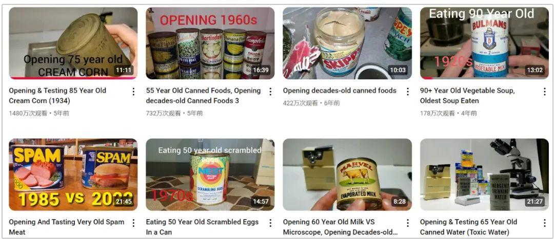 西方人比我們更喜歡喫罐頭,所以油管上,此類博主更多。他們會撬開85年前的奶油玉米罐頭,將那黃金美食緩緩倒入餐盤,在開罐的瞬間,罐頭髮出了EVA插入栓彈出的蒸汽聲,讓博主不禁感嘆:哇哦,聞起來不壞啊,不壞,現在水果發酵的香味甚至填滿了他的整個房間。