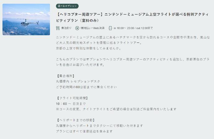 由任天堂前總部大樓改造的酒店「丸福樓」提供了一項新服務,遊客可以飛到博物館上空並看到完整的巨大問號方塊,途中還會飛到金閣寺、清水寺和嵐山等京都熱門旅遊景點。價格預計在19萬日元(摺合人民幣近9000元)。