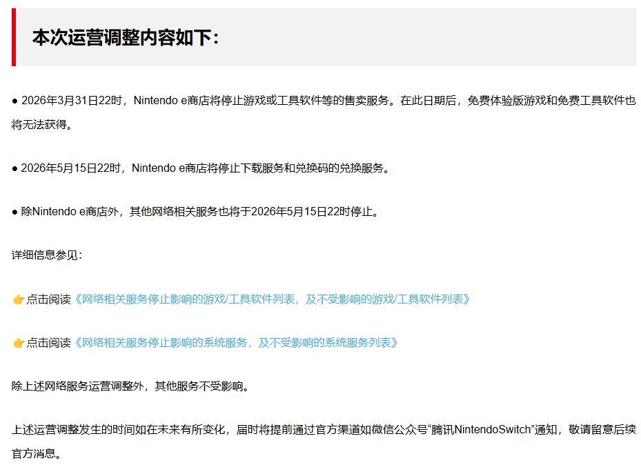 今日,騰訊國行Nintendo Switch官網發佈公告,將於2026年3月31日起至2026年5月15日,逐步停止Nintendo e商店和其他網絡相關運營服務。