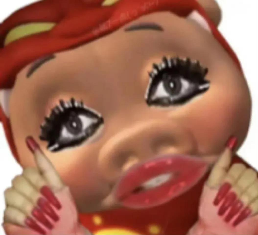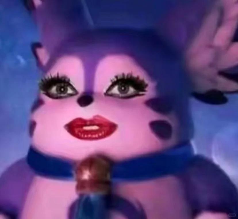 而它往往還會被P在一些可愛角色或者卡通角色的臉上,形成強烈的反差。有些還會在這幅表情的基礎上,加上一個戴了長美甲的雙手,就像下面這樣。