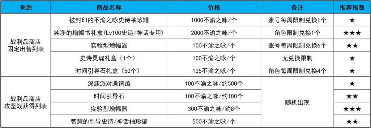 售價500不渝之詠,有可能開出史詩或神話裝備,兌換的優先級不是太高,小號非常缺裝備的情況下可以選擇兌換。