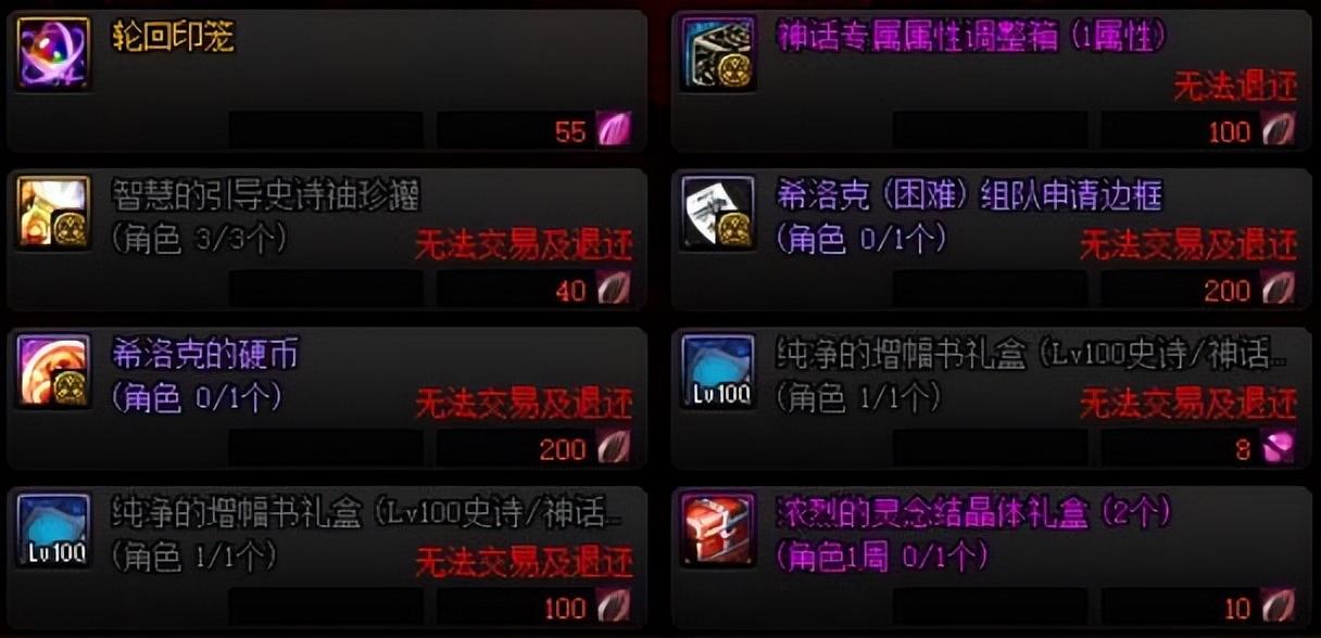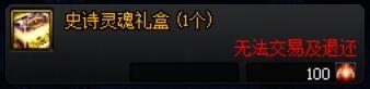 售價100不渝之詠,不限次數,可以通過NPC將賬號綁定的史詩靈魂兌換成可以交易的靈魂之源禮盒(1個),每天限制兌換10個,跨五拍賣行中靈魂之源禮盒(1個)的價格約爲6.5W金幣。