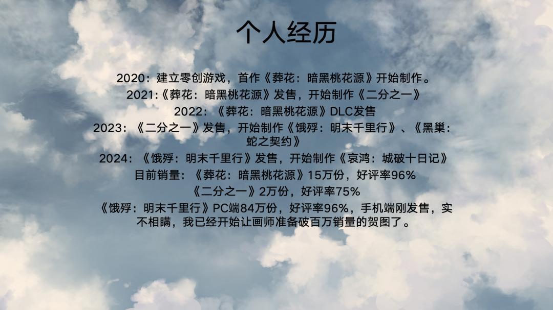 我的遊戲行業經歷是從2020年開始的。第一個做的遊戲是《葬花:暗黑桃花源》(下稱《葬花》),這款遊戲在2021年上線,目前銷量大概在15萬份左右。之後又做了《二分之一》,今年剛上線的是《餓殍:明末千里行》(下稱《餓殍》),手機端也剛上線,目前PC銷量是84萬份。