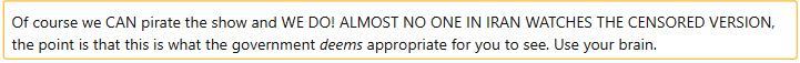 在討論伊朗版《雙城之戰》的帖子中,一位來自伊朗的女性用戶告訴大家,在伊朗,幾乎沒有人會去觀看這些被和諧的版本,大家都會使用VPN。