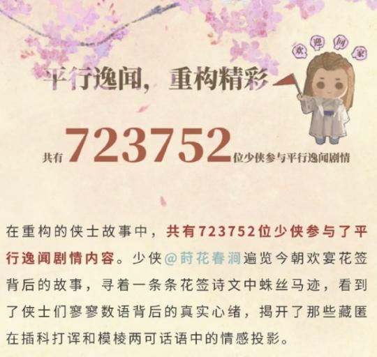 根據官方的統計,《一夢江湖》平行服開測六天共計迎來了1027766位少俠,有723752位少俠參與了平行逸聞劇情內容,311020位少俠參與了金陵麻將與鬥地主玩法,世界頻道發出了12227523條留言,人氣還是很火熱的。