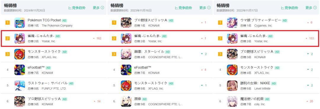 這周看榜單時,發現《雀魂》一路從日本iOS暢銷160多位殺到第2,僅次於大熱的《寶可夢TCGP》,這漲幅看着有點嚇人,不過算是最近幾年《雀魂》的常規操作。去年11月16日、4月26日,以及前年11月17日,它都衝到過同樣的位置。