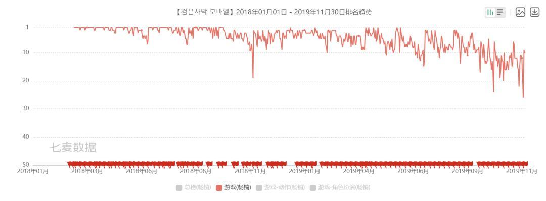 從韓國iOS暢銷榜也能看出,《黑色沙漠》手遊自2018年上線後兩年內,一直在維持着相當頭部的排名。