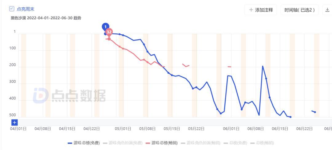 從iOS暢銷榜的排名情況來看確實如此,《黑色沙漠》手遊於2022年4月公測,與IP端遊定位類似,爲中世紀魔幻題材MMO遊戲,遊戲上線後曾登頂免費榜,位列暢銷榜第32名,但後續不到1個月,遊戲就從暢銷榜上消失,跌落速度比免費榜還快。