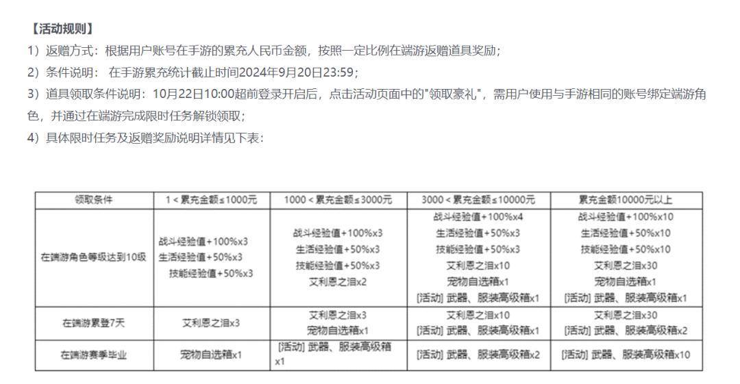 《黑色沙漠》手遊的官方公告中,也能看出研運雙方的重心傾斜。在端游上線前夕,《黑色沙漠》手遊同步推出了慶祝活動,手遊過往充值達到一定額度的玩家,可以獲得對應的端遊禮包;在手遊停運補償活動中,騰訊額外爲玩家提供了兌換《黑色沙漠》端遊禮包的機會。