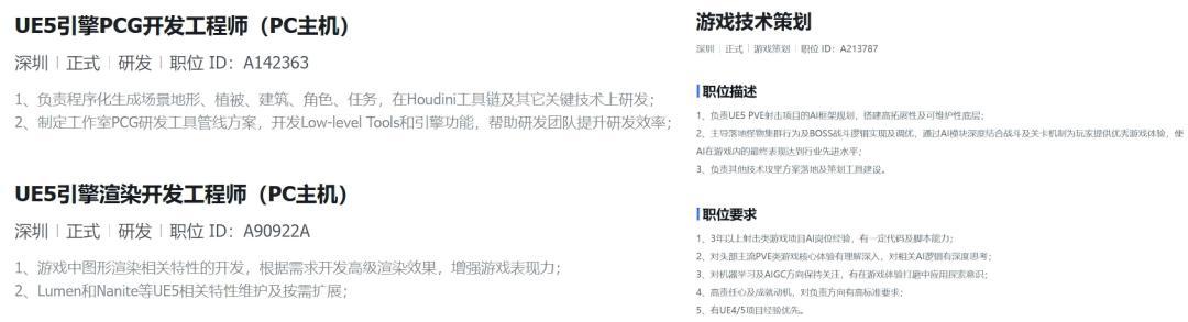值得一提的是,有知情人士透露,字節遊戲還在深圳組建了新的自研工作室,由曾參與過多款成功射擊產品的製作人帶頭,團隊正在研發一款射擊類新品。根據招聘信息,這款項目的關鍵詞有:UE5、PC主機端遊、PvE、3A。