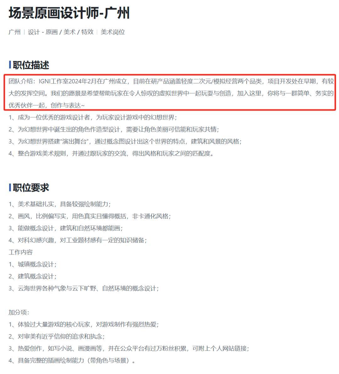 同時,根據沐瞳的招聘頁面顯示,他們於今年2月在廣州成立了IGNI工作室,在研產品涵蓋輕度二次元/模擬經營兩個品類。