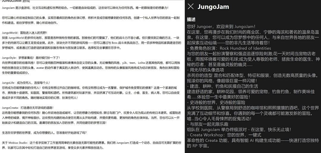 近期,該產品也在海外進行了測試。通過玩家評論、商店介紹,及知情人士透露,《Jungo Jam》的項目方向已經發生了變化。最早,該項目的方向是做遊戲平臺,有APP以及官方的PC編輯器,而現在它聚焦在了「role play」玩法,鼓勵玩家在虛擬世界中扮演各式各樣的角色,並通過AI創造自己的RP宇宙。