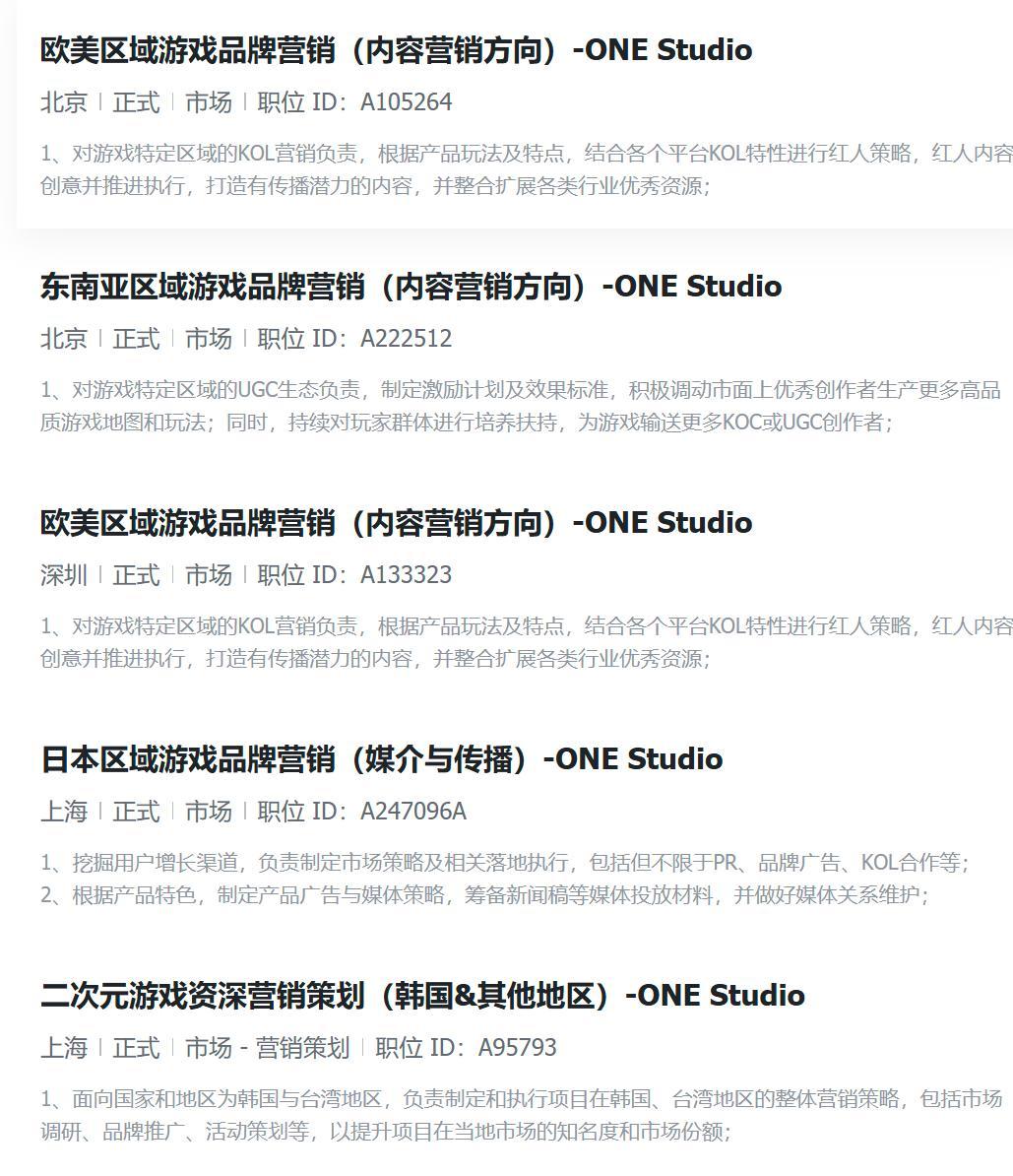 從官網的招聘信息來看,發行部門ONE Studio正在針對歐美、日本、東南亞等國家地區,招聘專項人才。而在研發人員的招聘信息中,「全球」「海外」也是高頻出現的關鍵詞。