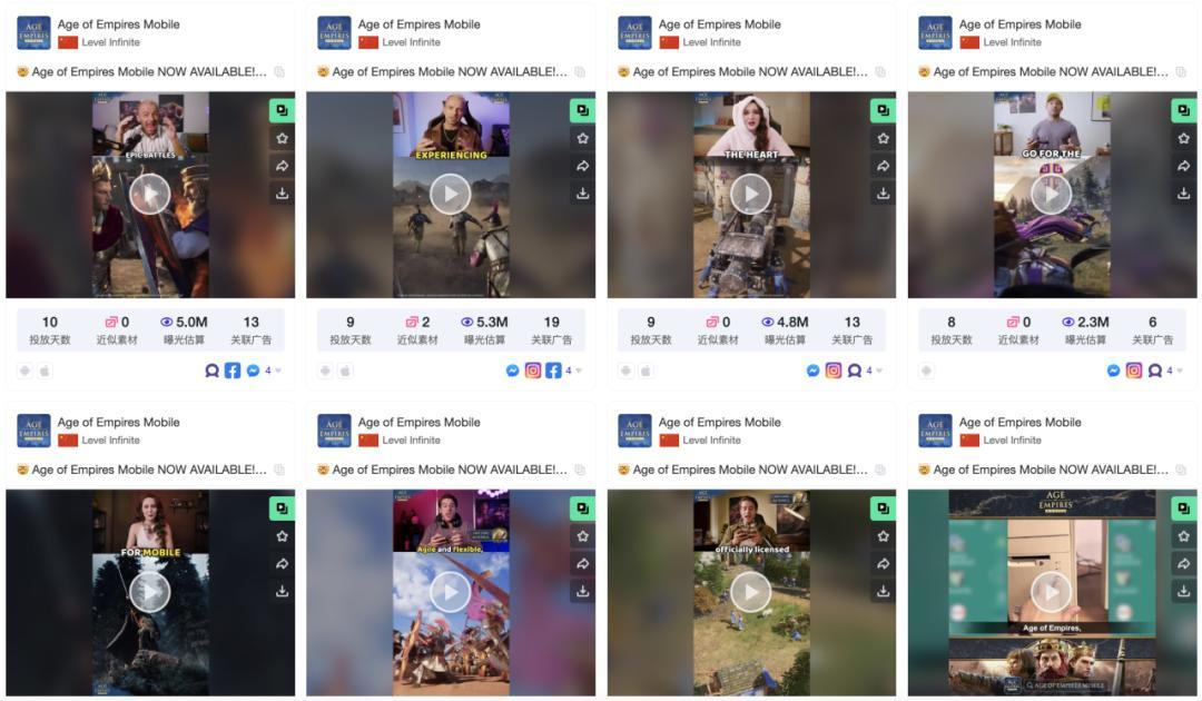 值得一提的是,《Age of Empires Mobile》並沒有投放時下流行的幾種副玩法素材。考慮到遊戲裏沒有對應玩法,貿然採用可能會被虛假宣傳所反噬;再者,副玩法買量的目的是儘可能地吸量,如果能夠激活《帝國時代》這個 IP 所積累下來的龐大粉絲羣體,同樣能獲得巨大的流量。