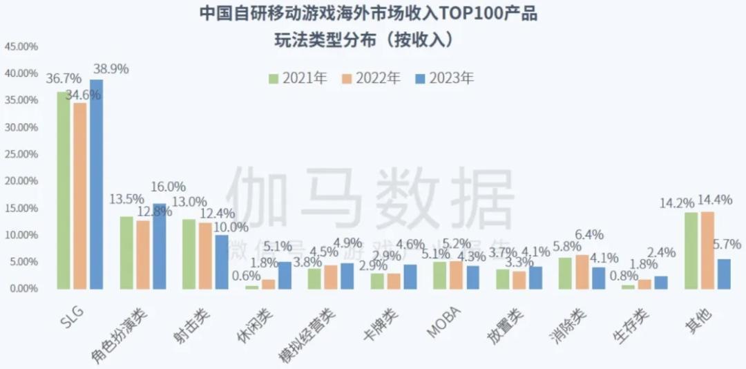 據伽馬數據統計,去年,在中國自研移動遊戲海外市場收入 TOP 100 產品裏,SLG 遊戲佔比高達38.9%,斷崖式領先其後佔比 16% 的角色扮演類遊戲,SLG 的吸金能力無需贅述。
