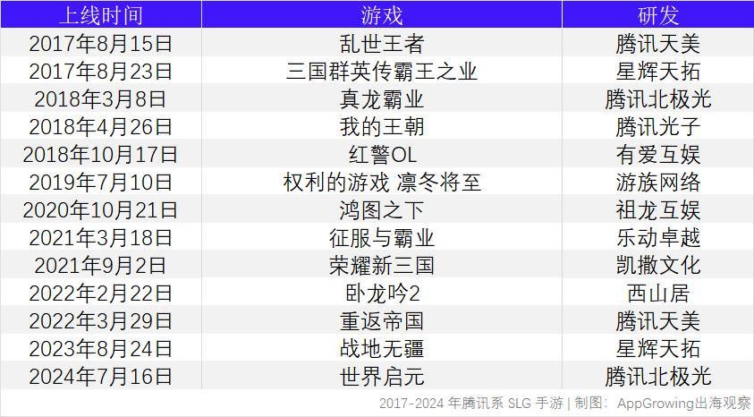 過去幾年,騰訊旗下 SLG 手遊在國內頭部位置的存在感並不強,海外由於佈局較晚,長時間處於缺席狀態。但這並不代表騰訊不重視這條賽道,恰恰相反,從下表(2017-2024 年騰訊系 SLG 統計)即可看出,騰訊對這個品類有着極深的執念。