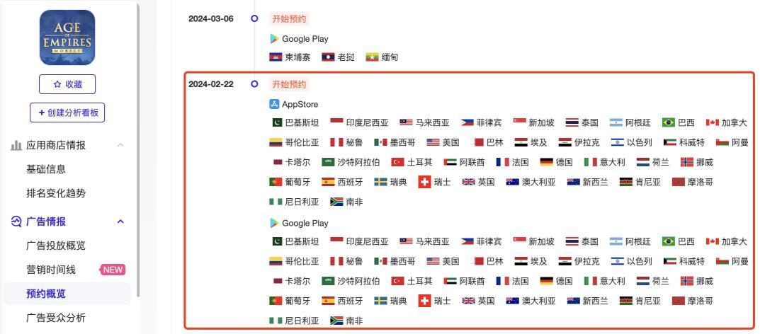 讓我們將目光轉向發行側。通過 AppGrowing 國際版 的“預約概覽”功能可知,《Age of Empires Mobile》早在今年 2 月底就開放了大部分地區的 AppStore 和 GooglePlay 預約。往回追溯,會發現官方 Facebook 賬號早在 2022 年底就開始運營,如今已經積累了 23 萬粉絲。
