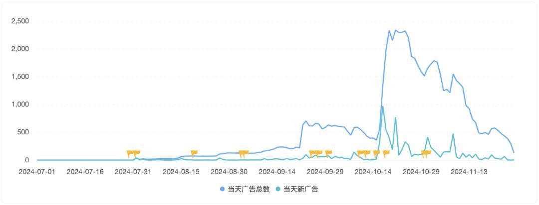 此外,《Age of Empires Mobile》的買量動作也更加靠前。AppGrowing 國際版 監測到,8 月初,《Age of Empires Mobile》就開始出現低量但卻連續且緩慢增長的投放活動;到了臨上線前一個月,投放量級出現明顯抬升,日均廣告投放數從 200 增加到 500;上線後投放進一步飆升,單日最高廣告投放數一度逼近 2500 組,通過集中爆發,遊戲得以激活已積累的玩家並確保更廣泛的用戶覆蓋。