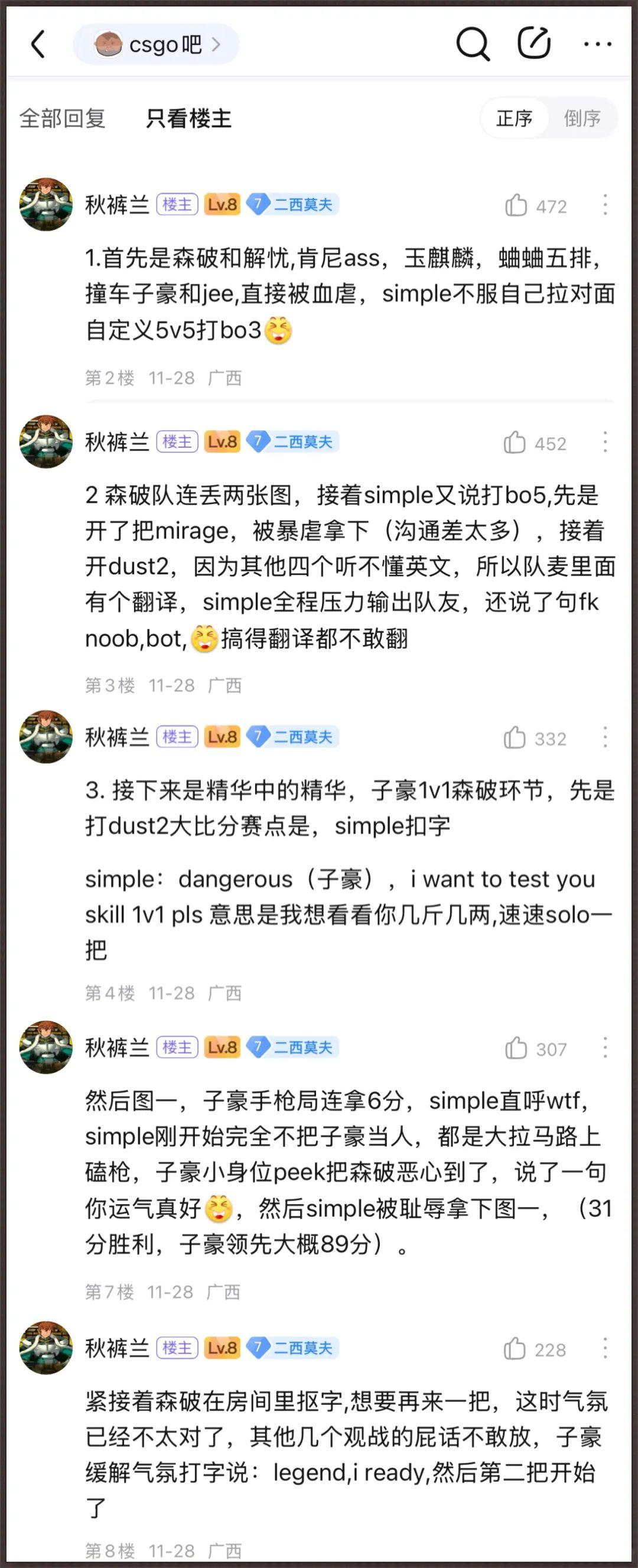 據說最開始是s1mple和解憂、kennys、玉麒麟、蛐蛐五排,撞了RA選手子豪和jee帶老闆的五排黑車,直接被血虐。