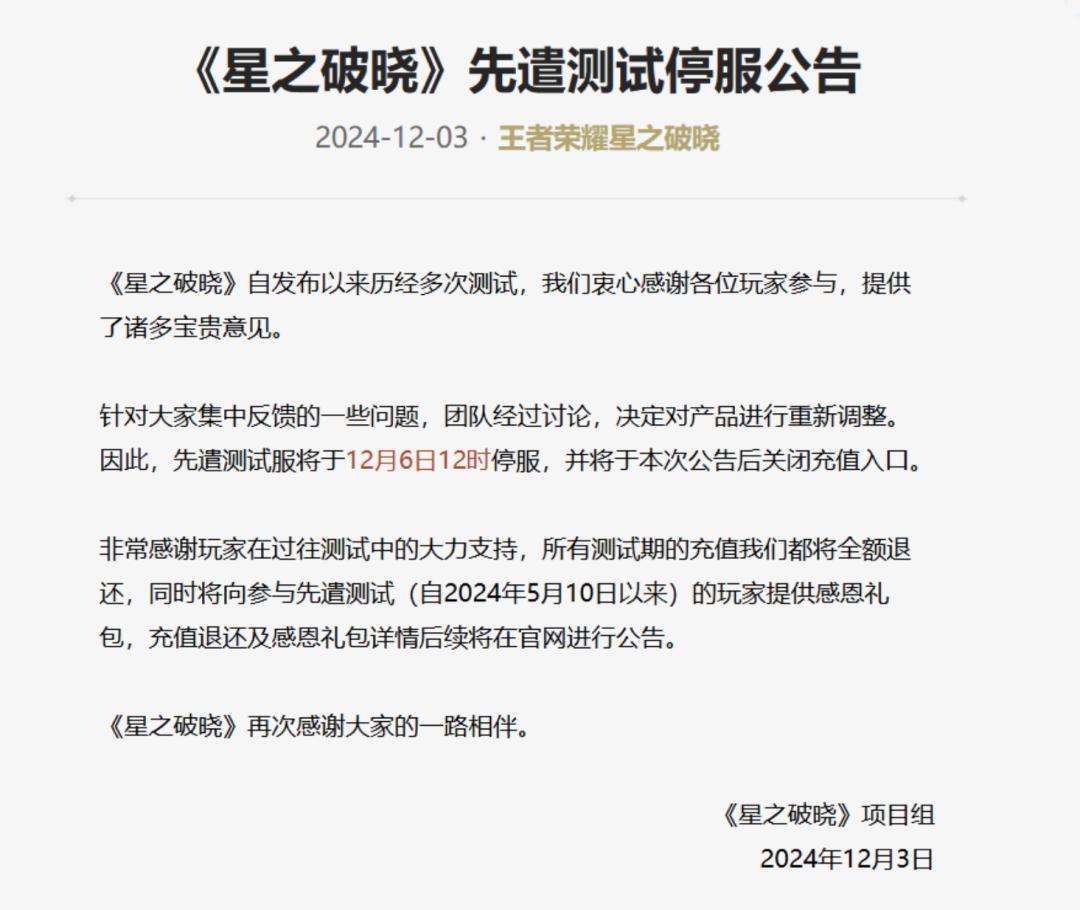 剛剛,騰訊天美J5工作室研發的《王者榮耀:星之破曉》發佈公告稱,經團隊討論,決定對產品進行重新調整,因此先遣測試服將於12月6日停服,並向玩家全額退還測試期的充值,以及向參與先遣測試的玩家提供感恩禮包。