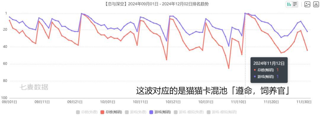 《戀與深空》先前9月、11月都曾衝到暢銷總榜榜首