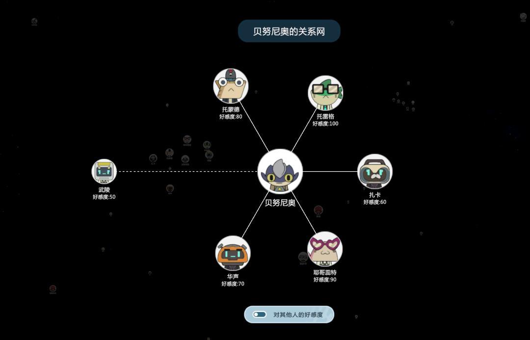 比如說,這些NPC之間的關係相當複雜,是一個非常完整的小社會。劉寒向我展示了一個立體的模型,上面展示了不同NPC之間錯綜複雜的關係。玩家與任何一名角色交好或交惡,都有可能觸發一系列連鎖反應。
