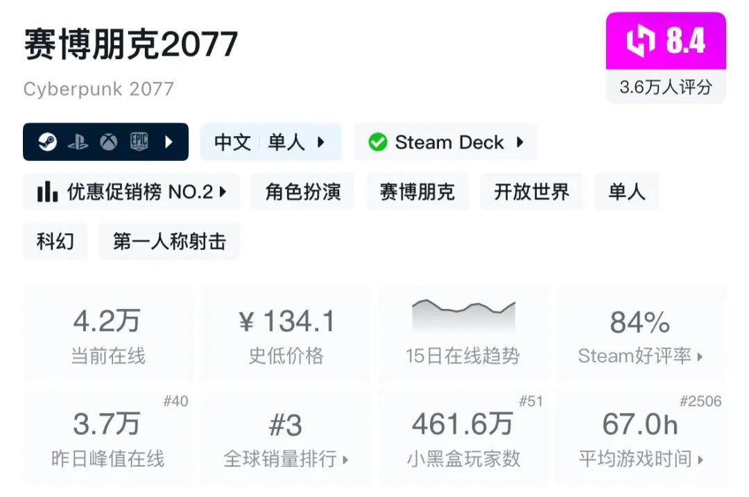 喜歡這種題材的玩家也確實多。11月24日,《賽博朋克2077》官宣總銷量突破3000萬,而僅在小黑盒平臺上,中國用戶就高達460萬,考慮到非小黑盒用戶和主機玩家,中國玩家數量或許遠比這個數字更高。