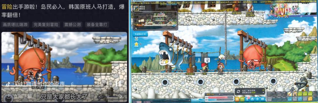 侵權買量廣告(左),《冒險島》運行畫面(右)