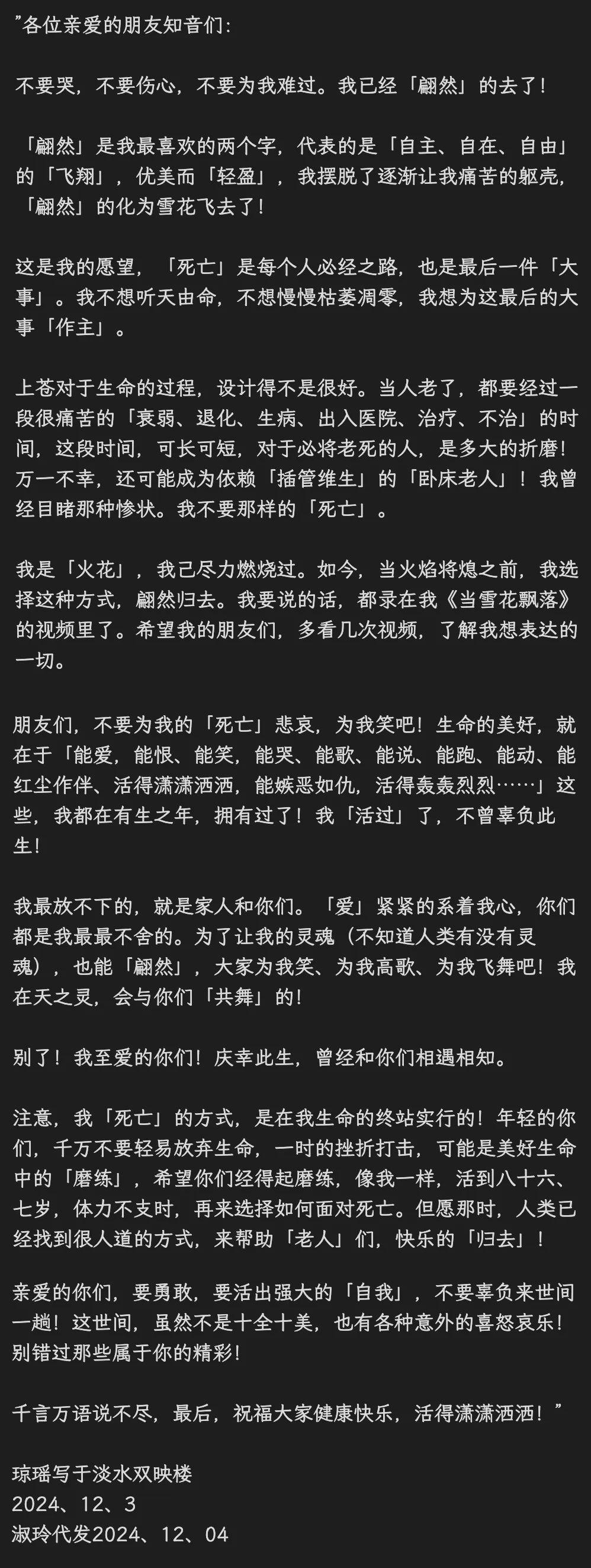 她說「要說的話,都錄在我《當雪花飄落》的視頻裡了。希望我的朋友們,多看幾次視頻,瞭解我想表達的一切。」生前錄製的告別視頻↓