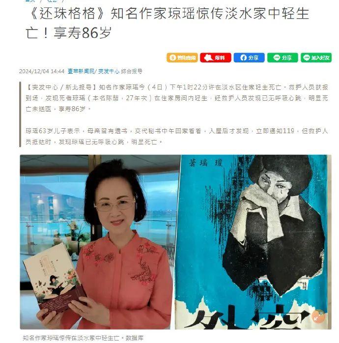 據臺灣媒體12月4日消息,下午1點22分許,知名作家瓊瑤在臺灣新北市淡水區的自己家中輕生,享年86歲。瓊瑤代表作有《窗外》、《還珠格格》、《煙雨濛濛》等。