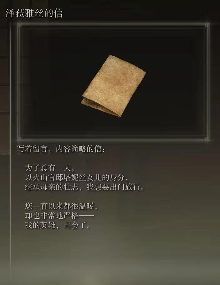 如果你和我一樣,在《艾爾登法環》拉婭支線中選擇告訴她身世的真相,不給她喝遺忘藥水。就會得到拉婭的信,她會稱讚你是位溫柔的英雄,並勇敢地踏上屬於自己的旅程。