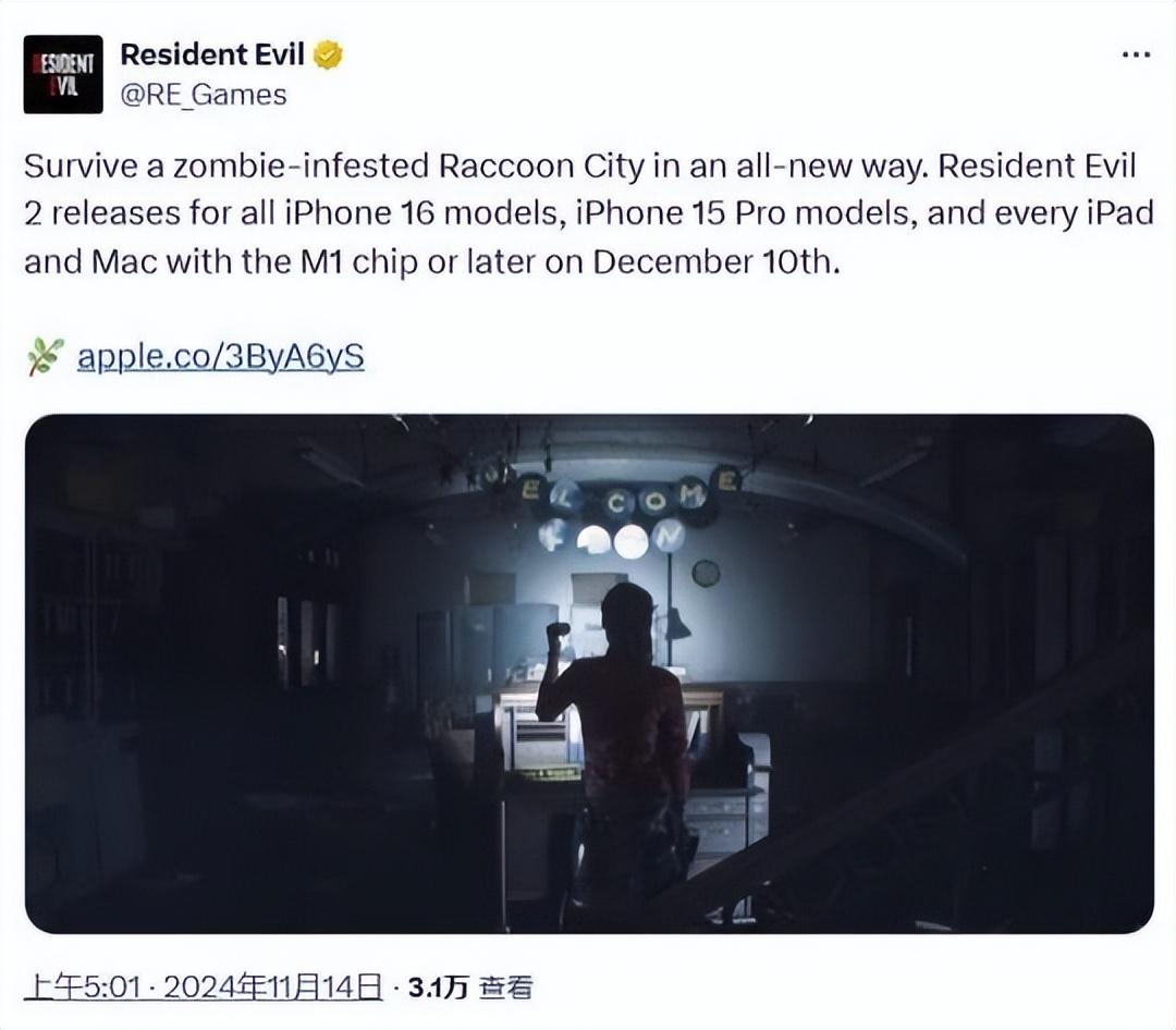 卡普空宣佈《生化危機2:重製版》的iPhone、iPad和Mac版本將於12月10日正式發售,玩家可通過App Store獲得,遊戲將與所有iPhone 16型號、iPhone 15 Pro型號以及所有配備M1或更高版本芯片的iPad和Mac兼容。
