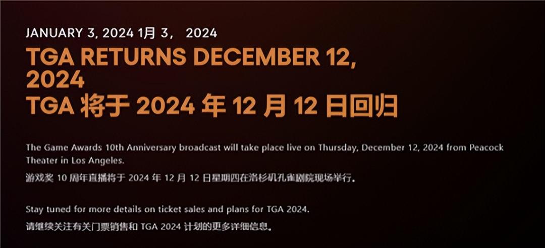 The Game Awards(TGA)官方發佈公告稱,2024年的頒獎典禮將於12月12日在美國洛杉磯舉行。