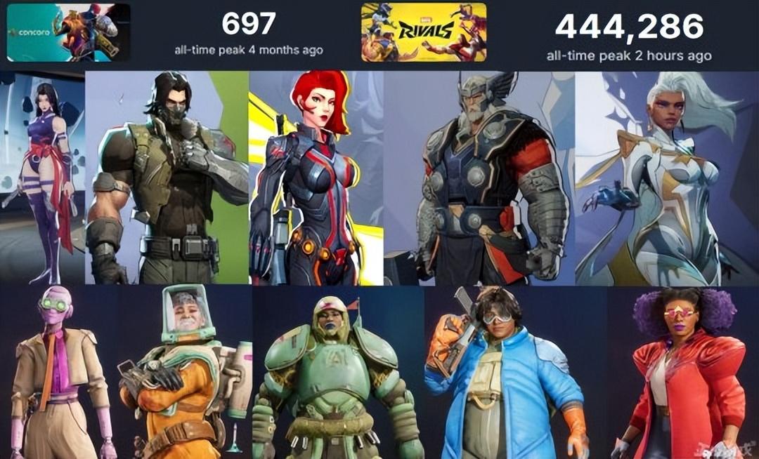 公測後國外還有大佬還就特意做了個對比圖,內容是《漫威爭鋒》和《星鳴特攻》人物以及在線人數的對比。
