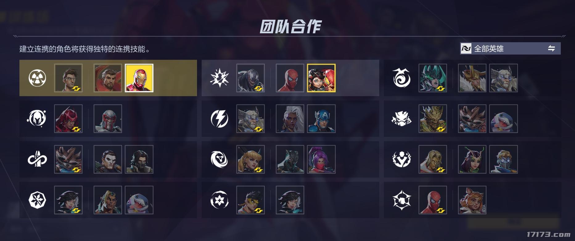 此外一個很重要的設計,是我覺得遊戲玩法中的最大特色亮點,是引入的陣容連攜系統,各英雄之間存在combo效果,一旦組成特定陣容,便會增加一個新技能欄位,提供特殊的攻擊手段或增益效果。這一系統旨在引導玩家選擇官方推薦的陣容搭配,和漫威原著劇情有着各種暗合,但也存在陣容限制的問題。